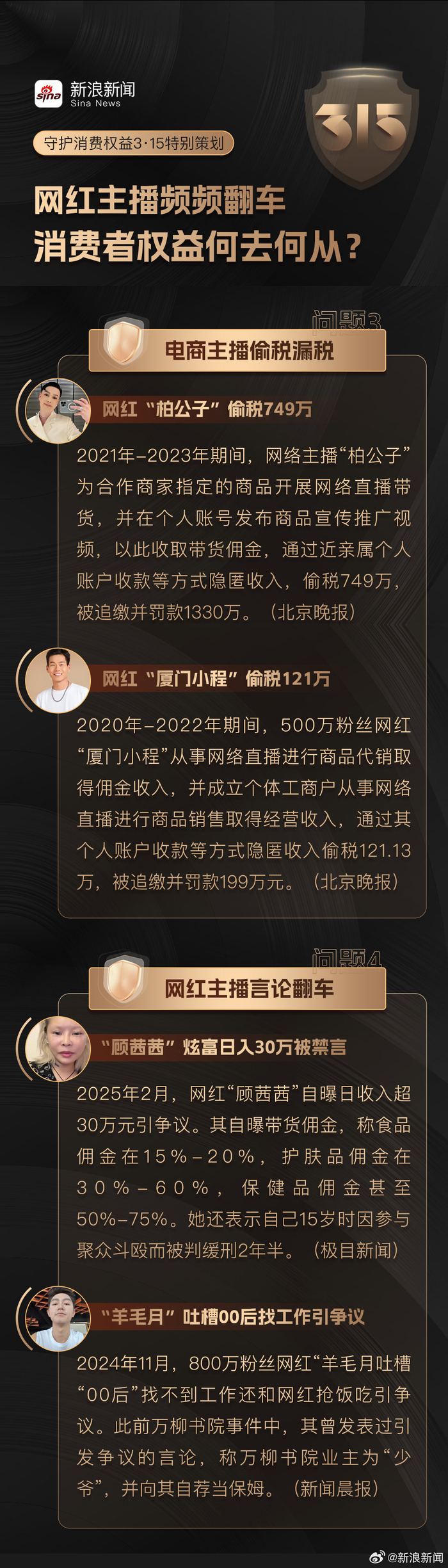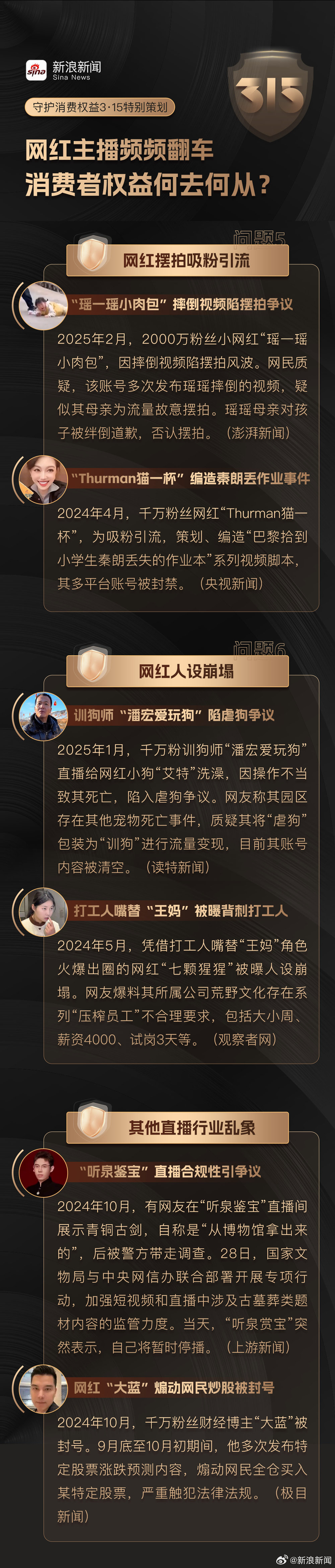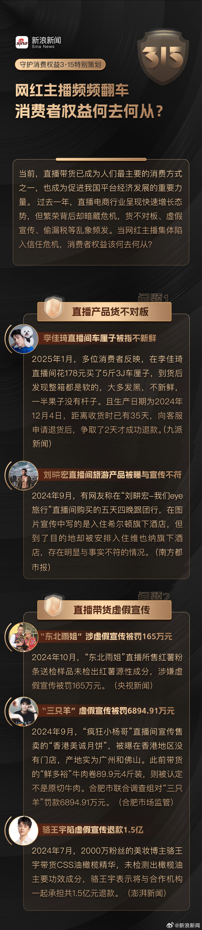 【3·15特别策划 | #翻车是网红主播的宿命吗#】#哪些网红主播在过去一年塌房了# 过去一年被不少网友戏称为“网红塌房元年”。从李佳琦带货车厘子翻车到“疯狂小杨哥”美诚月饼被打假,再到训狗师“潘宏”爱狗人设崩塌,头部网红主播接连塌房。当前,直播行业仍呈现快速增长态势,但当网红主播集体陷入信任危机,消费者权益该何去何从?#守护我的消费权益#