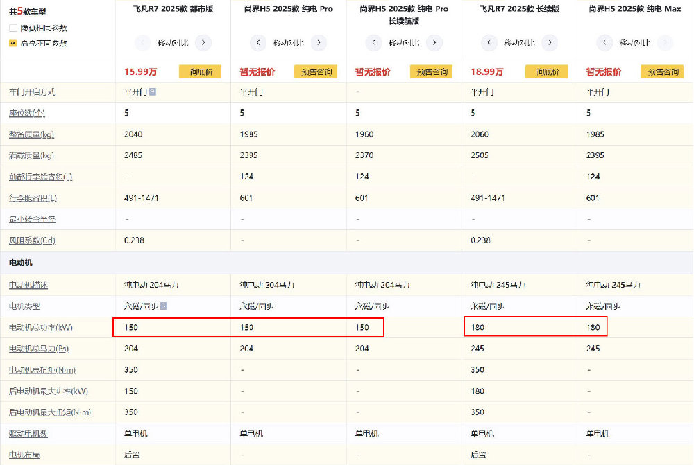 咱们使用某车垂网站对比工具,罗列出来飞凡R7和尚界H5部分配置,值得特别指出的是,飞凡R7配备了四轮通风盘,尚界H5则被标注为前通风盘/后实心盘,不知道是不是标错了,等车辆上市后,或者各位车友看到尚界H5新车之后不妨确认一下。