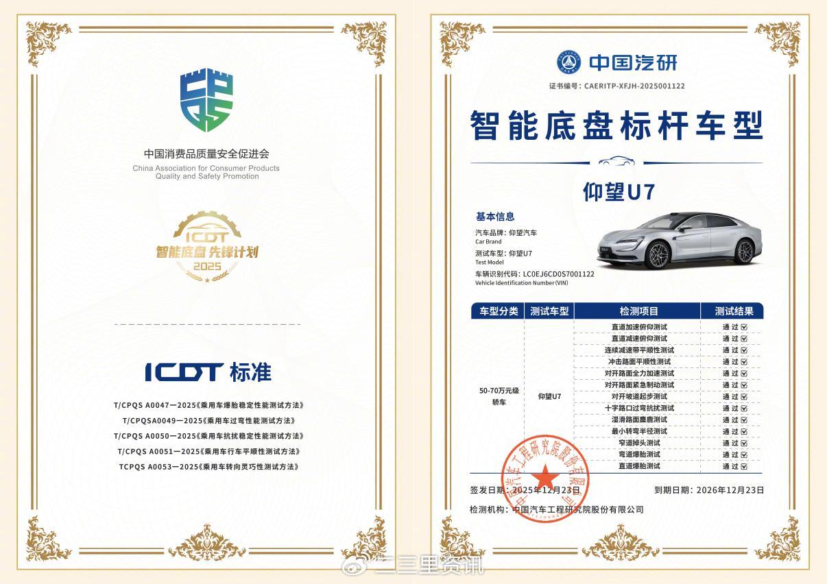 12月23日,由中国汽车工程研究院股份有限公司(中国汽研)发起的“2025智能底盘先锋计划”正式发布评测结果。仰望U7(配置|询价)凭借领先的智能底盘技术与全面的实测表现,荣获最高荣誉“智能底盘标杆车型”,成为参评车型中唯一通过全部13项工况测试的车型,充分彰显其在安全性、舒适性与操控性方面的综合实力。