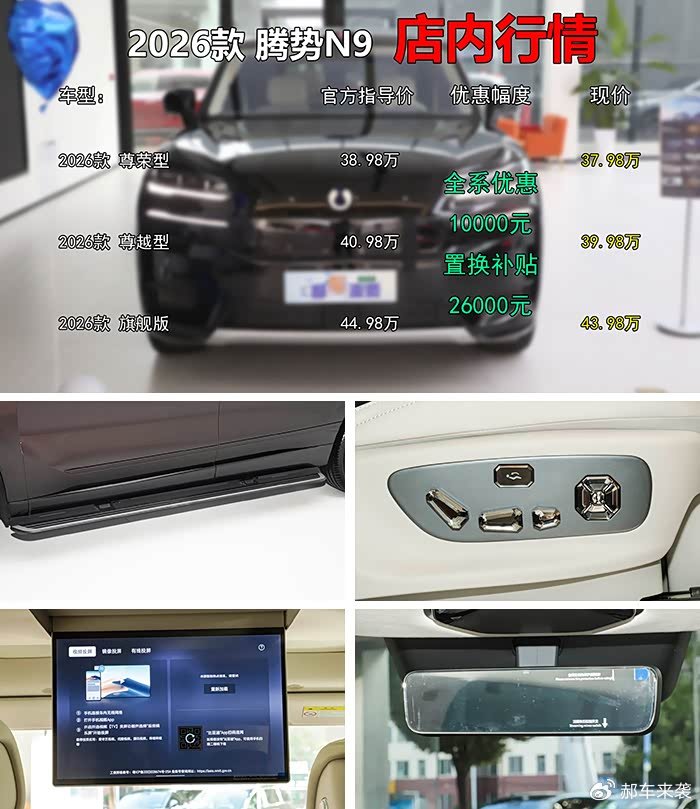 近日,根据郝哥探访北京地区某腾势展厅得知,现在购买腾势N9直降现金10000元,除此以外,置换还能享受26000元补贴。至于如何选择,首先中配尊越型比低配尊荣型预算增加2万元,配置上主要围绕的是豪华属性提升,包括17.3英寸后排大屏、副驾零重力座椅、流媒体后视镜以及电动脚踏板等等,郝哥觉得如果想兼顾商用且预算充足倒可以考虑,但论纯家用还是低配尊荣型更划算。