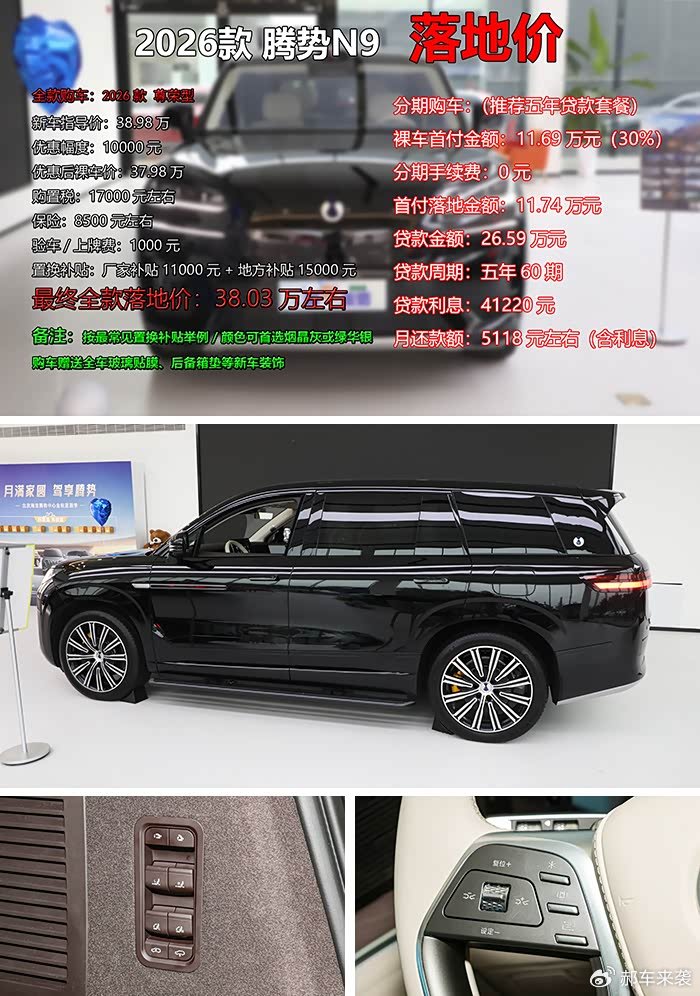 《郝车来袭》原创导购:作为比亚迪旗下高端电动新势力,腾势品牌自从脱离奔驰加持后反而知名度大幅提升,其中腾势D9(配置|询价)更成为别克GL8和丰田赛那等主流MPV最强劲的竞争对手,而今天郝哥要为您介绍的这款新车,号称腾势旗下旗舰SUV—腾势N9(配置|询价),2026款腾势N9共在售三款车型,售价区间38.98万~44.98万元,那么新车优惠力度如何呢?推荐配置落地价得多少钱?养车成本又高不高呢?