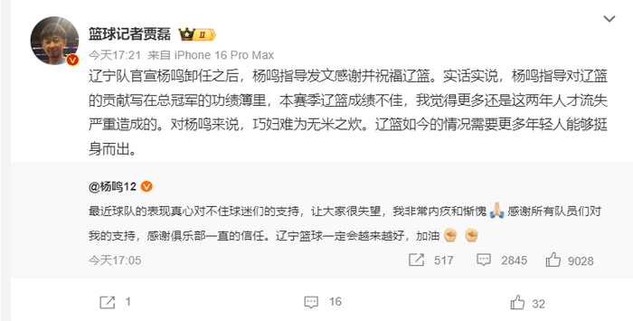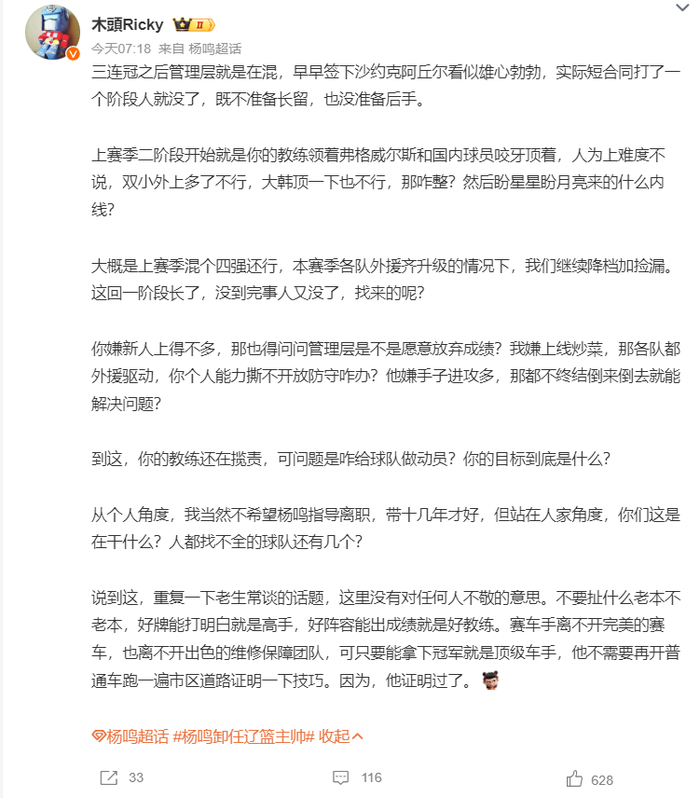 大V们纷纷不满辽篮管理层的做法,他们认为杨鸣沦为了俱乐部的替罪羊: