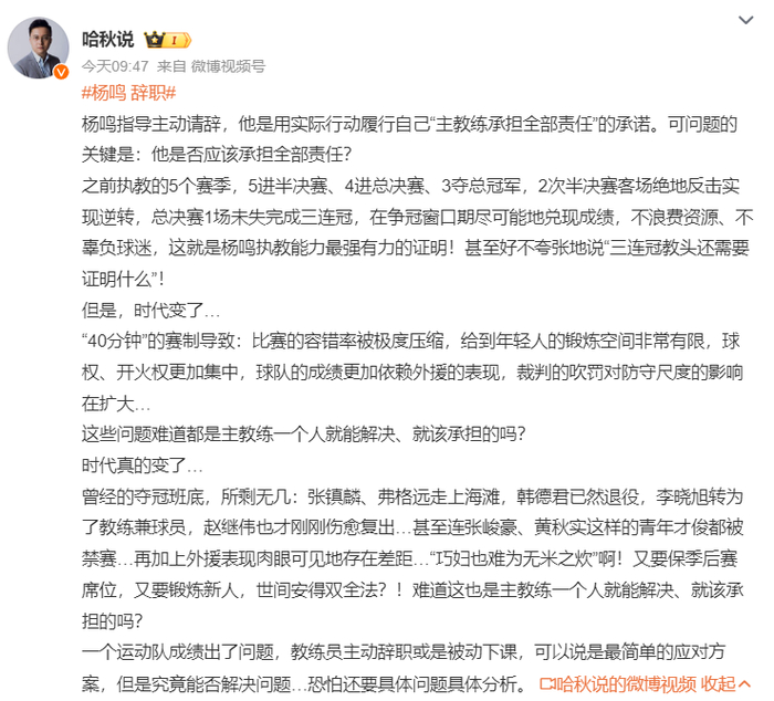 辽宁球迷都知道杨鸣是有能力的主教练,之前的5个赛季,5次进入四强,4次进入总决赛,三次拿到总冠军,他的辞职必然引发巨大的议论。