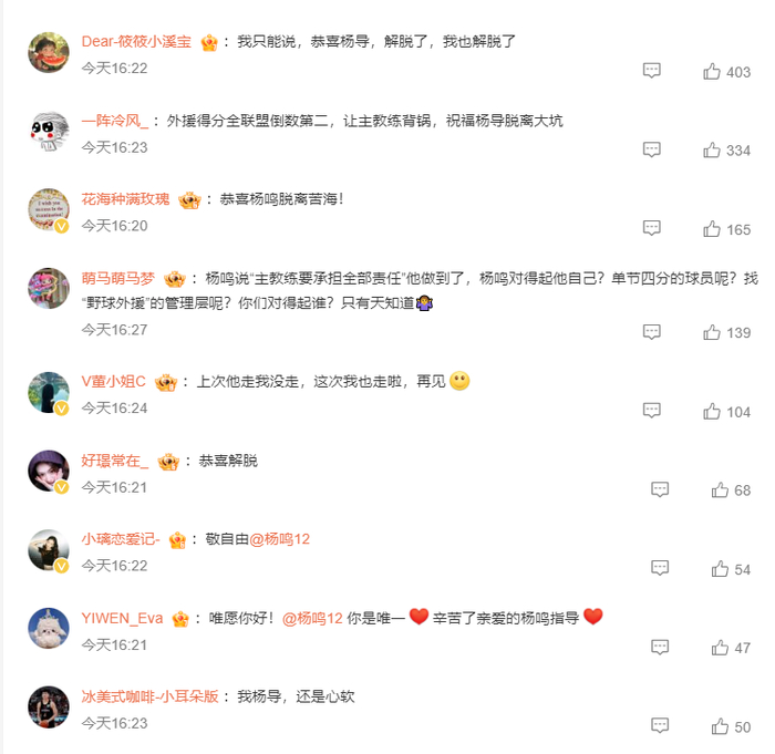 不少的球迷都在辽宁男篮官方下恭喜杨鸣脱离苦海,杨鸣指导解脱了,球迷们也解脱了。