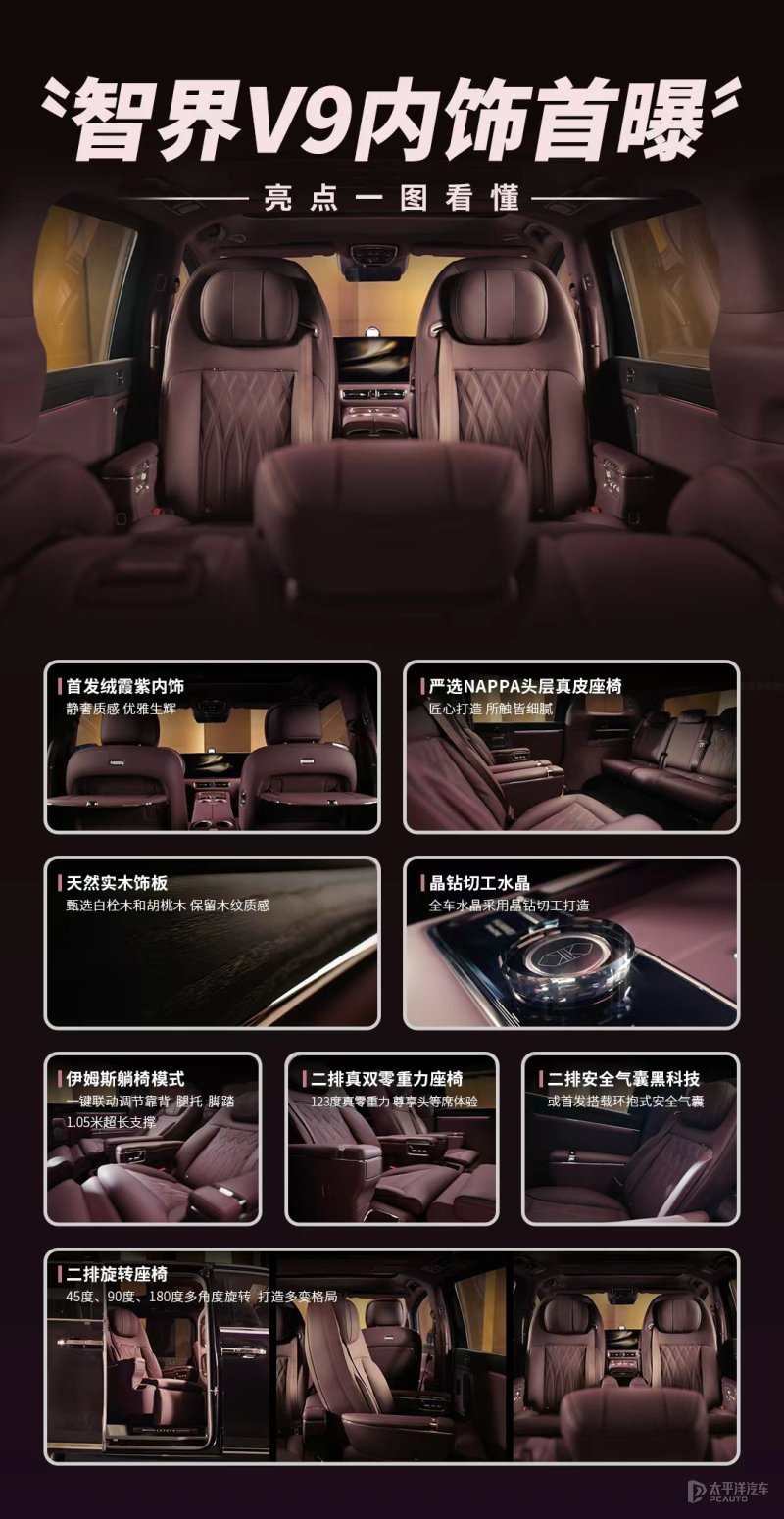 从发布的内饰官图来看,智界V9采用三联屏设计,风格与尊界S800(配置|询价)相似,配备了绒霞紫内饰配色,且用料极为考究,包括采用NAPPA头层真皮座椅、天然实木饰板、晶钻切工水晶的旋钮等高端材质。