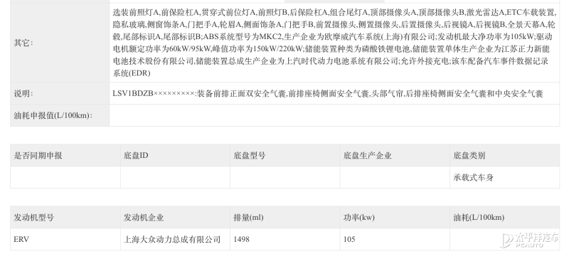 此次申报的ID.ERA 9X提供了丰富的选装项,除外观相关的灯组、保险杠、饰件外,还包括顶部摄像头、激光雷达、ETC车载装置、前置/侧置/后置摄像头等科技配置,隐私玻璃、全景天幕等舒适配置也在可选范围内。安全配置方面,新车标配前排正面双安全气囊、前排座椅侧面安全气囊、头部气帘、后排座椅侧面安全气囊及中央安全气囊,保障驾乘安全。