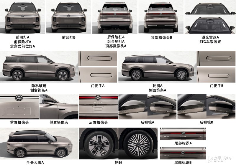 从申报图来看,上汽大众ID.ERA 9X采用封闭式前脸设计,搭配贯穿式前位灯,视觉上营造出宽体效果。前照灯与前保险杠均提供两种可选方案(A/B 版本),可满足不同视觉需求。