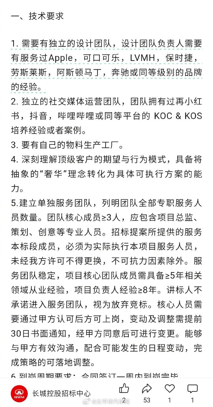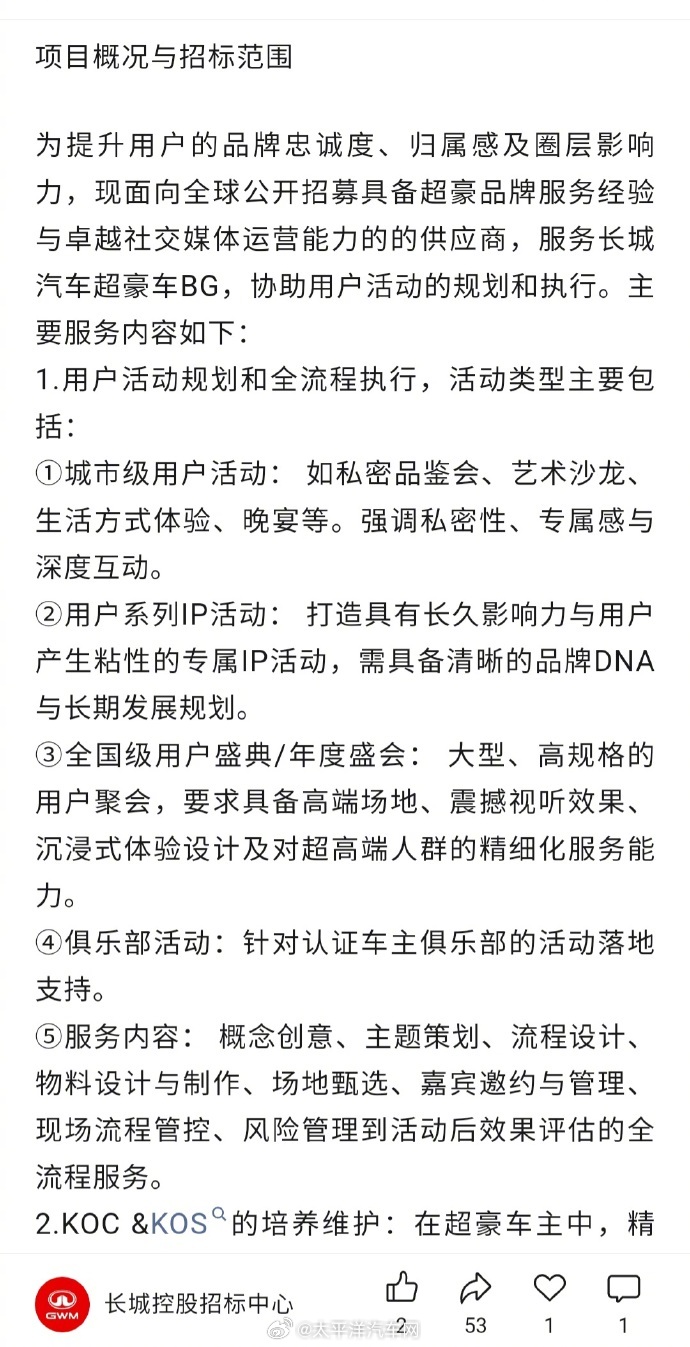 长城超豪车 BG 全球招供应商,得有服务过苹果、劳斯莱斯等的经验,还得有超豪用户活动案例。