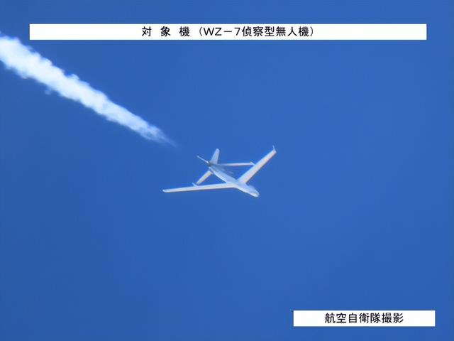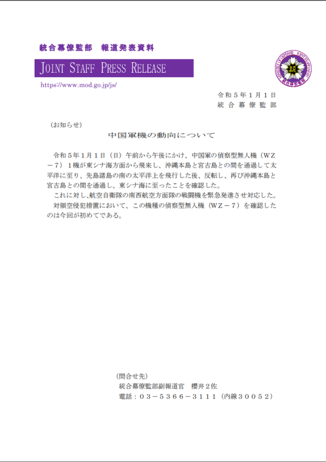 据日本“防卫省统合幕僚监督部”在社交媒体上公布的信息显示,令和5年1月1日(星期日)上午至下午,一架WZ-7无人侦察机从东海方向飞来,从冲绳本岛和宫古岛之间飞过,在先岛诸岛南部的太平洋上飞行,然后掉头,再次回到冲绳本岛附近,从宫古岛之间通过,确认飞回东海。航空自卫队西南航空方面队的战斗机紧急起飞应对,并首次拍摄到WZ-7的画面!