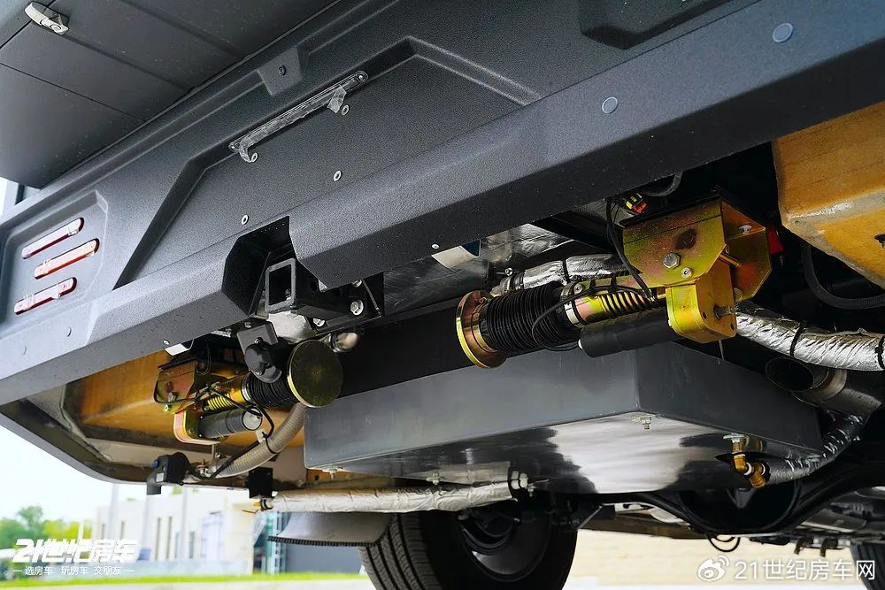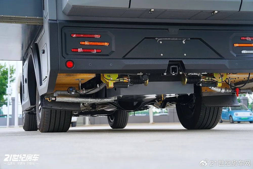 底盘的承载能力达到了4.5吨,相比一般皮卡房车3.5吨的载重有了显著提升。为了实现低重心,底盘采用模块化设计,水电等设备均放置于底盘以下,为应对复杂路况提供了更好的稳定性。