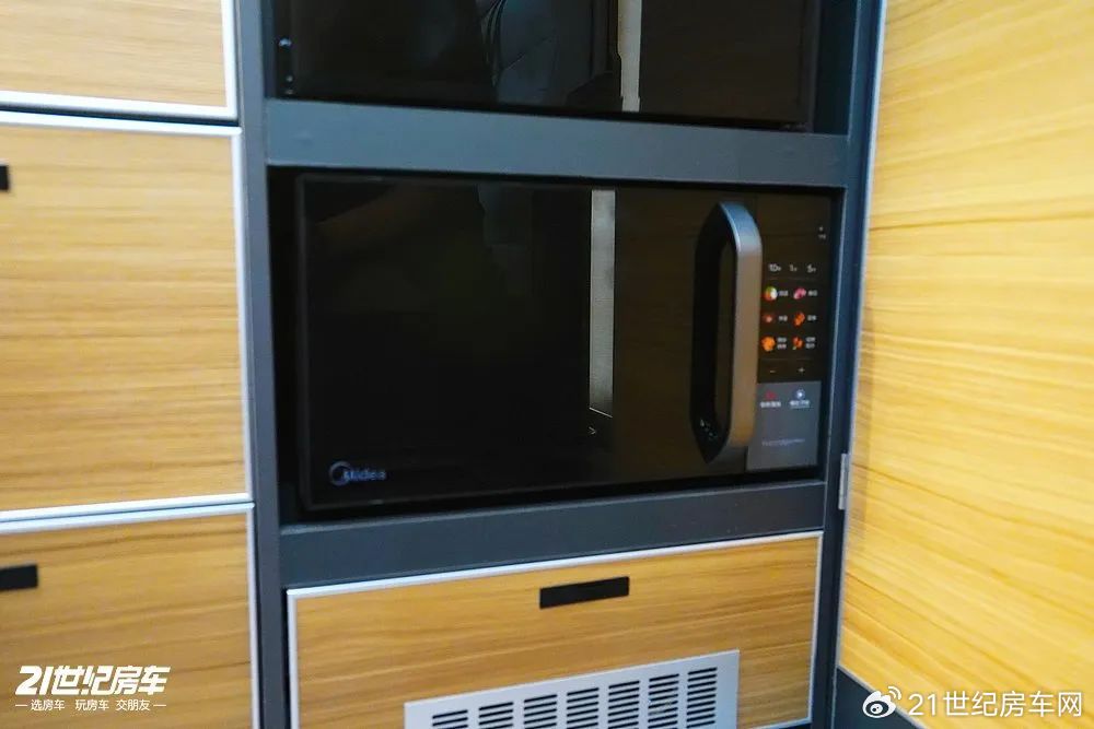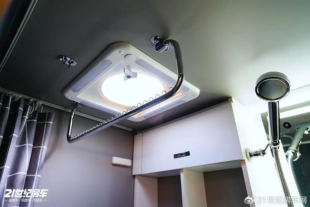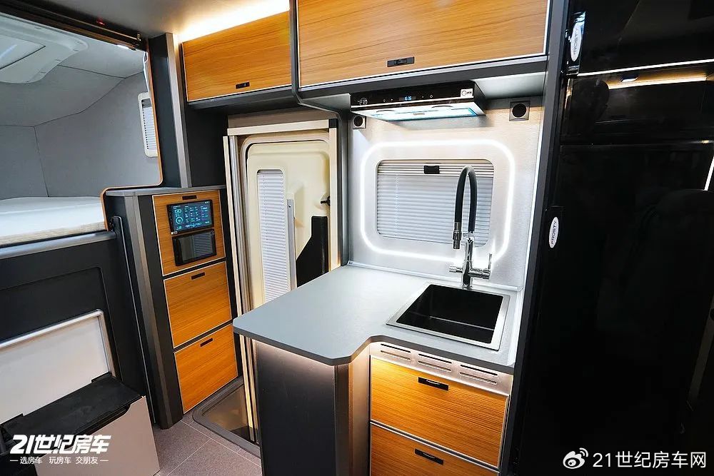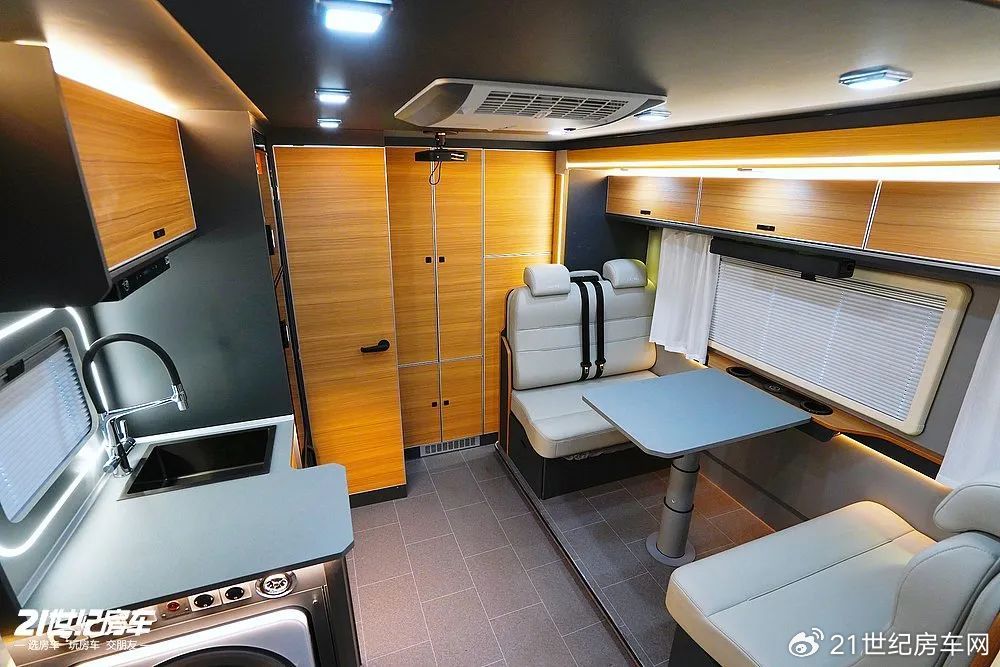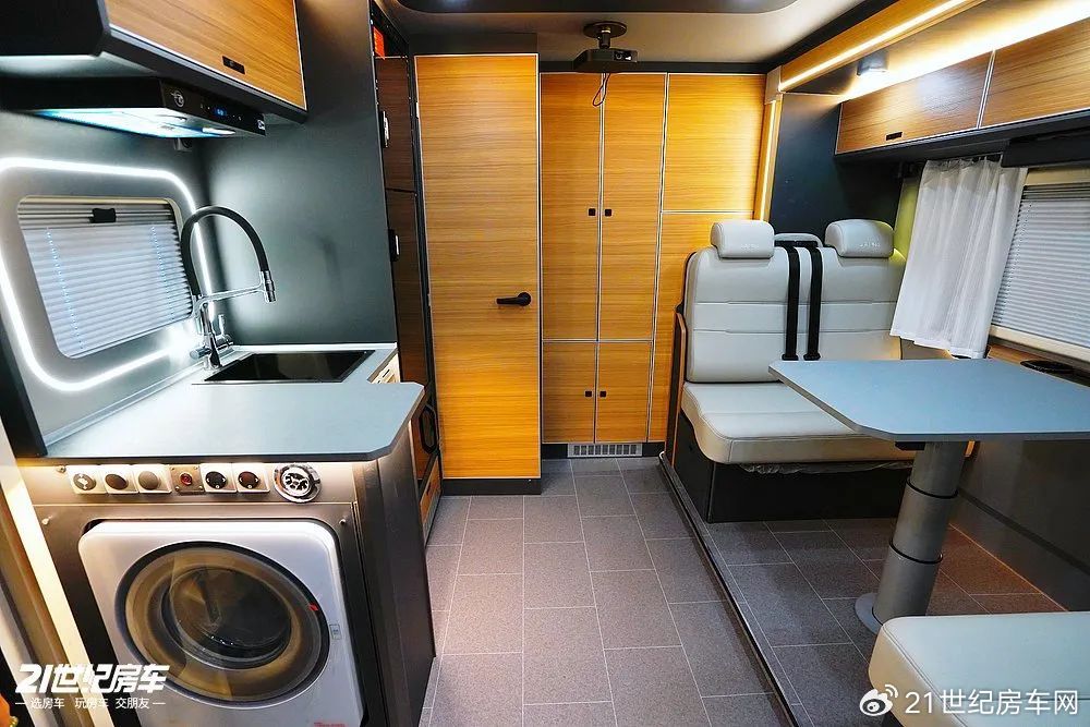 值得一提的是,厨台下方还内嵌一台洗衣机,巧妙解决用户在旅居过程中衣物清洗问题,并且因为位置正好设计在进门处,晾晒衣物也更加轻松省力。厨房区上方还配备了抽油烟机,能够有效排出烹饪时产生的油烟,保持车内空气清新。