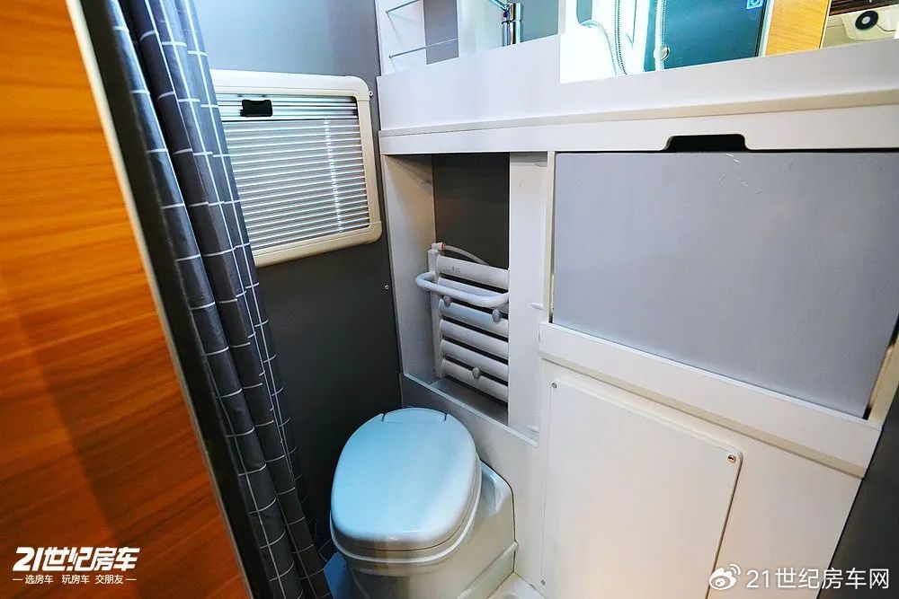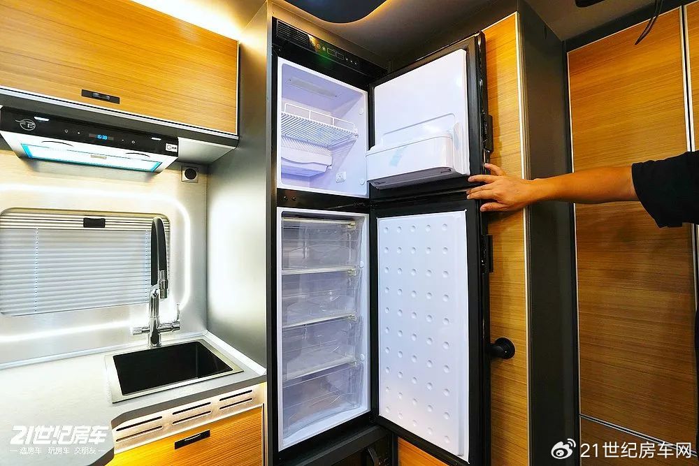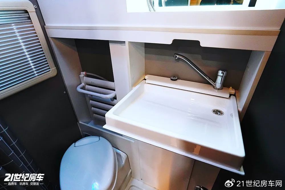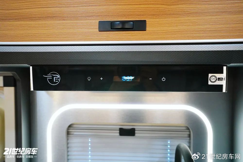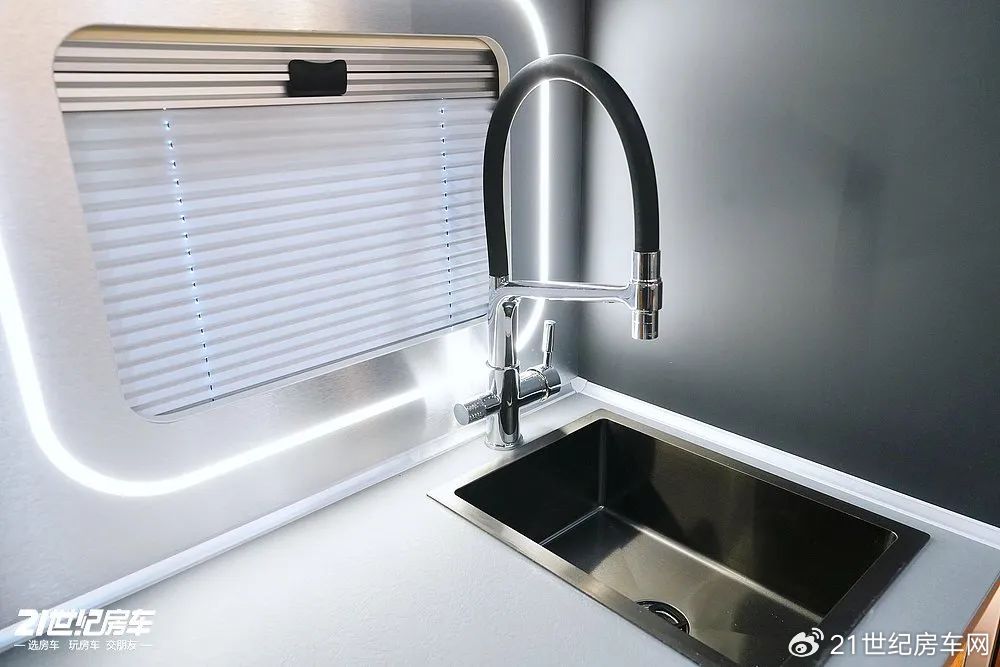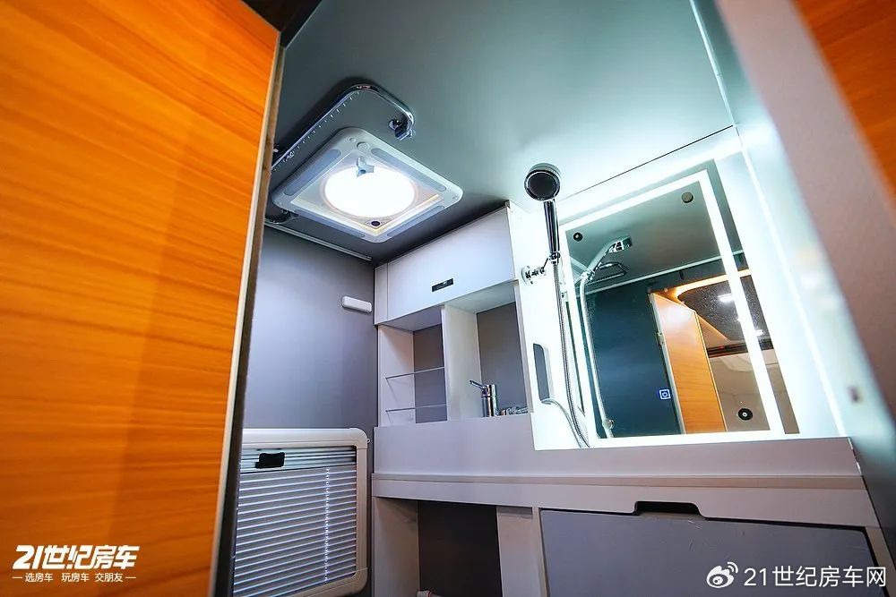 值得一提的是,厨台下方还内嵌一台洗衣机,巧妙解决用户在旅居过程中衣物清洗问题,并且因为位置正好设计在进门处,晾晒衣物也更加轻松省力。厨房区上方还配备了抽油烟机,能够有效排出烹饪时产生的油烟,保持车内空气清新。