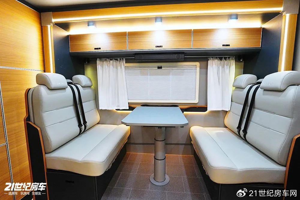 中部会客区位于侧拓展结构上,采用双人对卡座设计,腿部空间和对卡座的宽度都十分宽裕。中间配备有气动升降桌,满足车友在此用餐、娱乐或办公的需求,必要时可组合拼成一张临时休息区域,为车内增加了额外的睡卧空间。