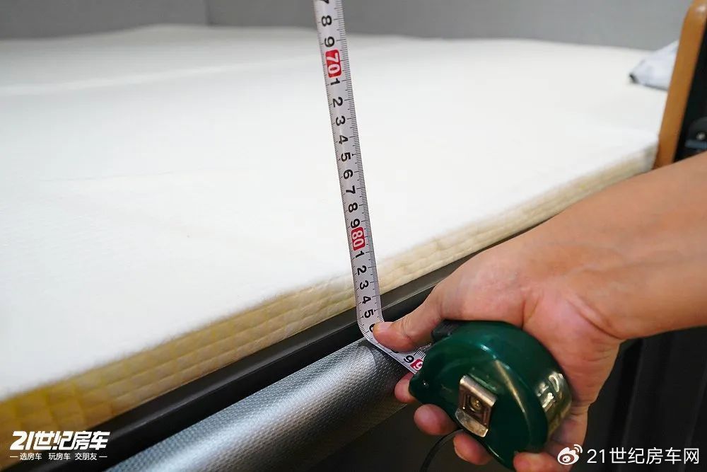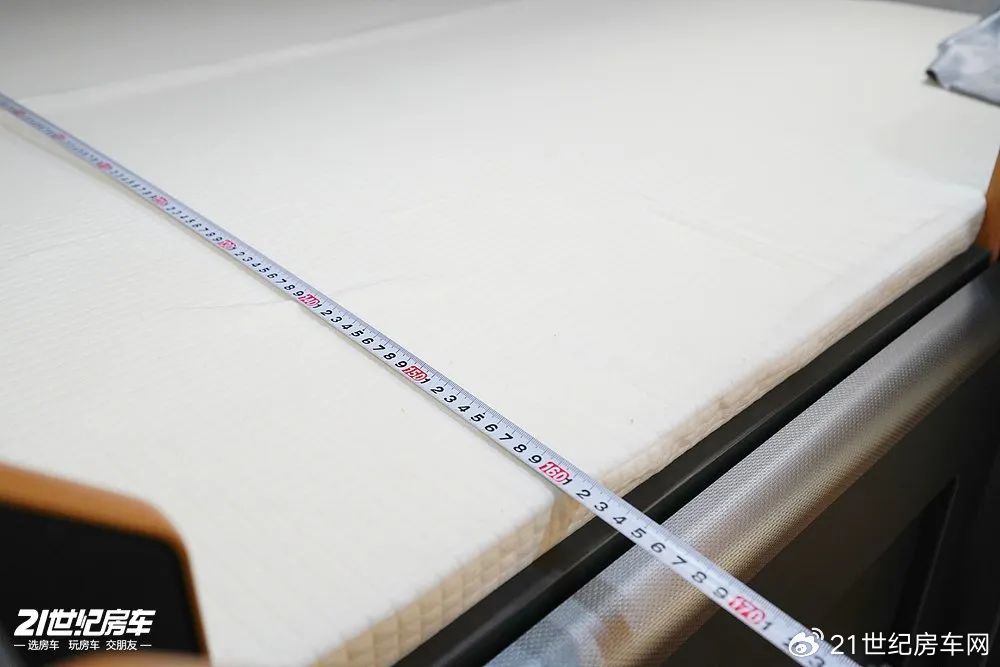 驾驶室上方配备有额头床,床铺尺寸宽阔,实测约2.15x1.6m,能够轻松满足双人休憩使用。额头床内部最大高度约85cm,人在上面可以较为舒适地活动。