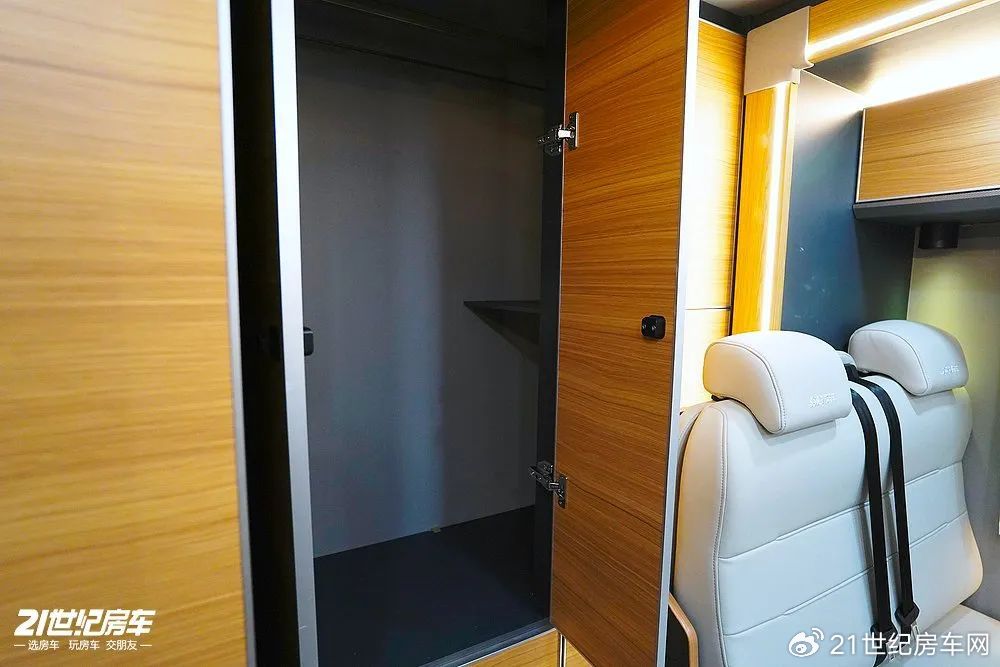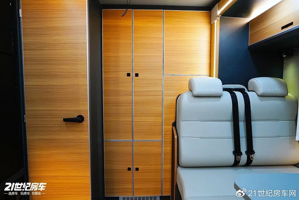 生活区正后方是一整面的组合储物空间,每一个柜子的进深都非常可观,大大增加了房车的储物能力,可以装下出门在外诸多的生活用品。