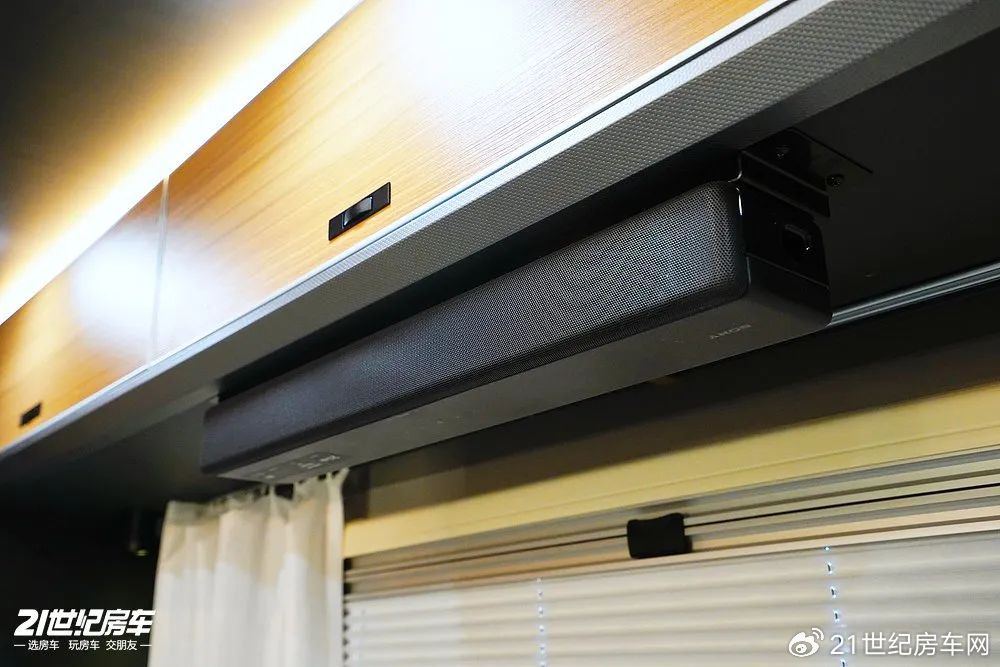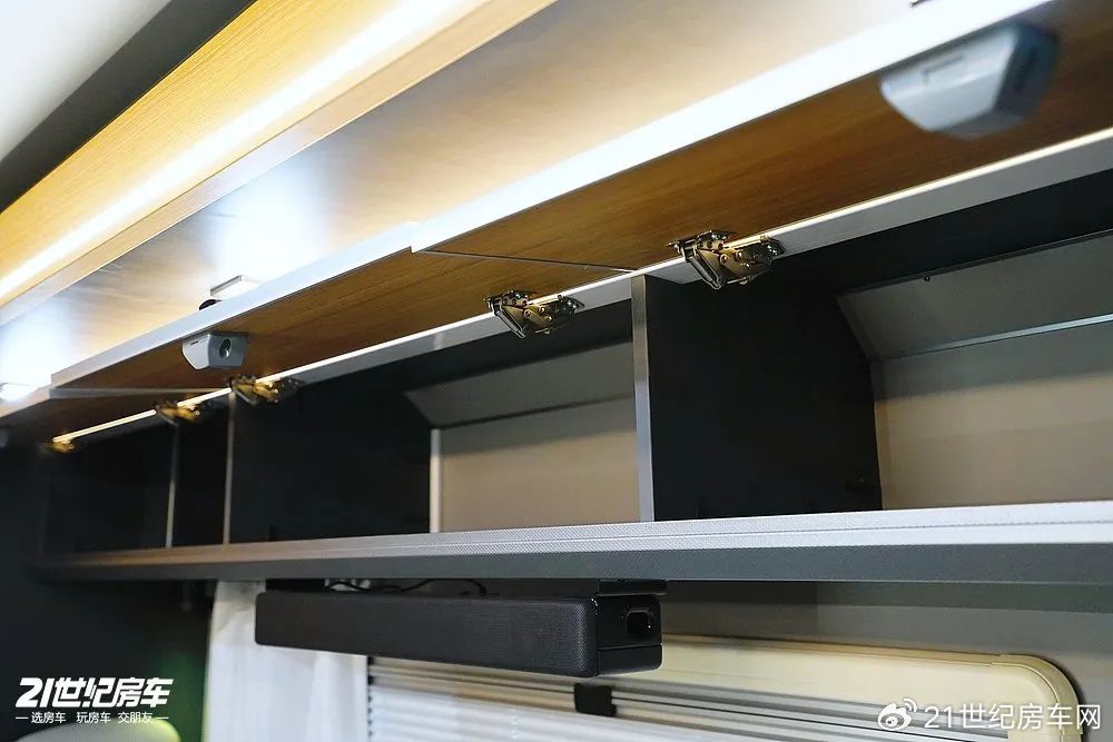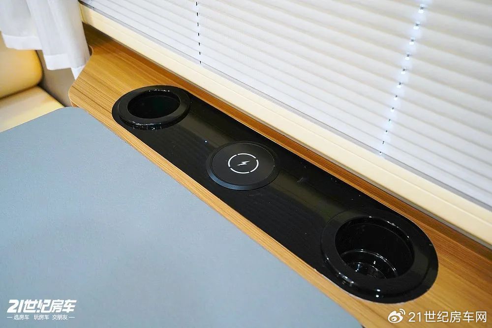 会客区上方还配有三格储物吊柜,车友可以进行对琐碎物品的收纳。吊柜的下方还安置了一台索尼音响,增添了娱乐属性。会客区还注重细节设计,如配置有手机无线充、杯槽等便利性设施,符合用户日常的使用习惯。