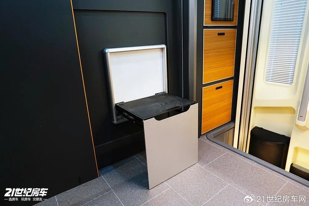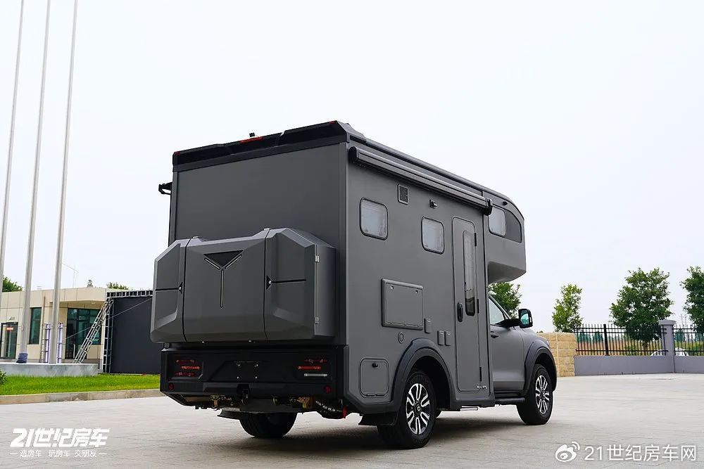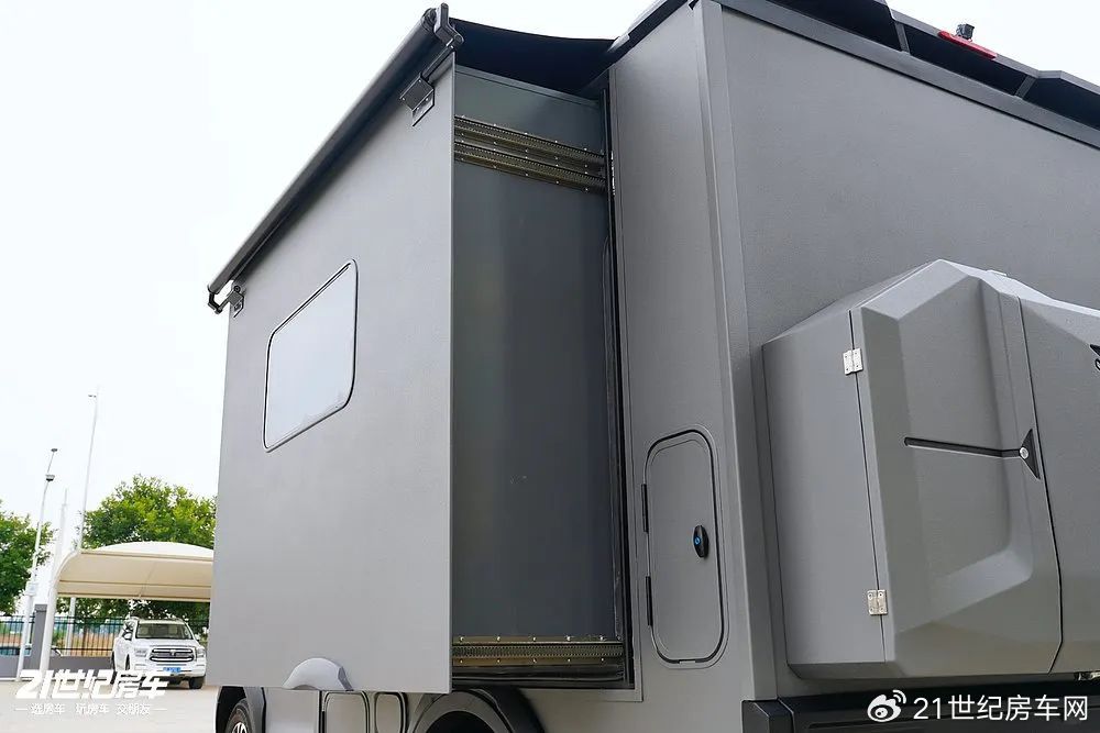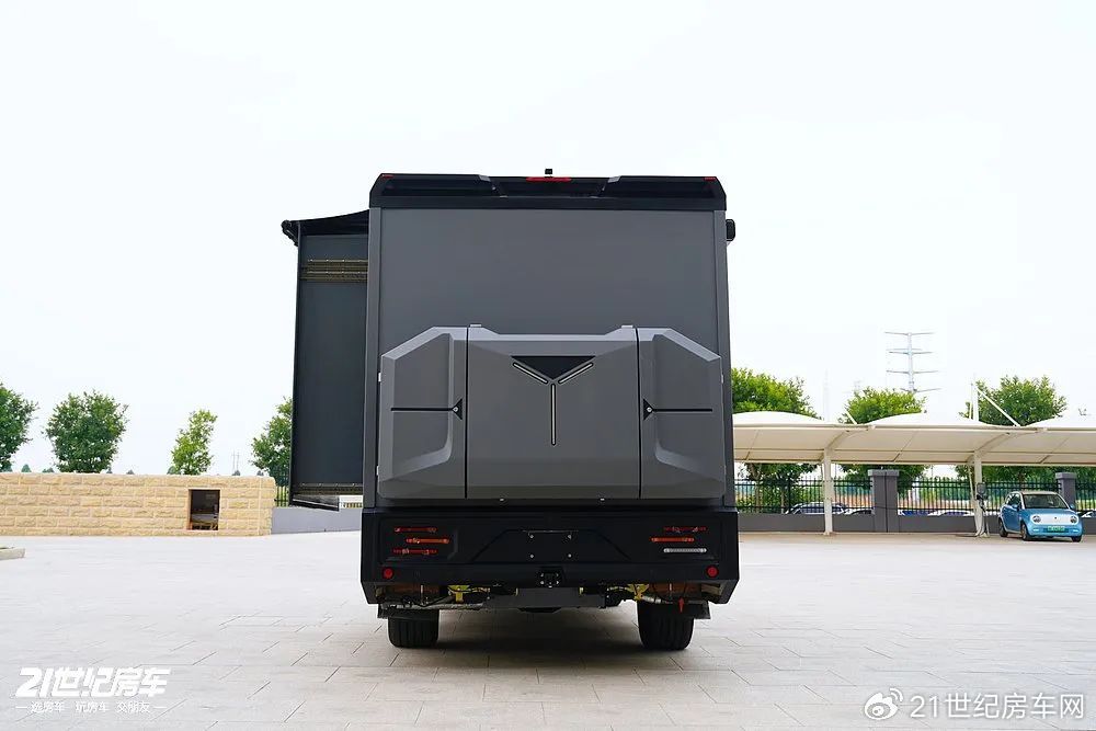 车尾处安置了电动支腿,驻车时能够让车身更加稳定。车尾还设计了一个机甲风满满的行李箱,方便用户放置户外露营装备或者行李物品。