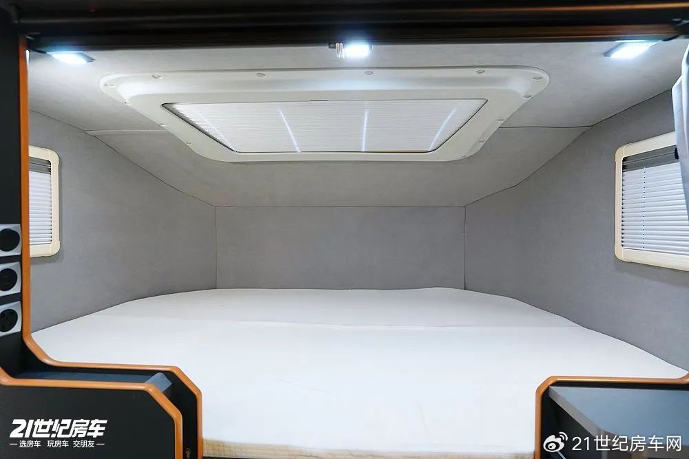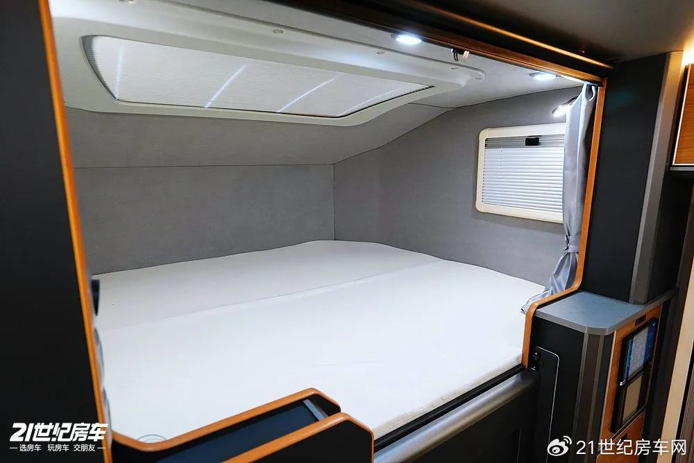 床铺两侧以及顶部均配备有窗户,不仅为内部带来明亮光线,还能在休息时欣赏到窗外的美景,通风换气效果也极佳。额头床通过驾舱与生活区隔门上的折叠爬梯来登床,设计巧妙且实用。