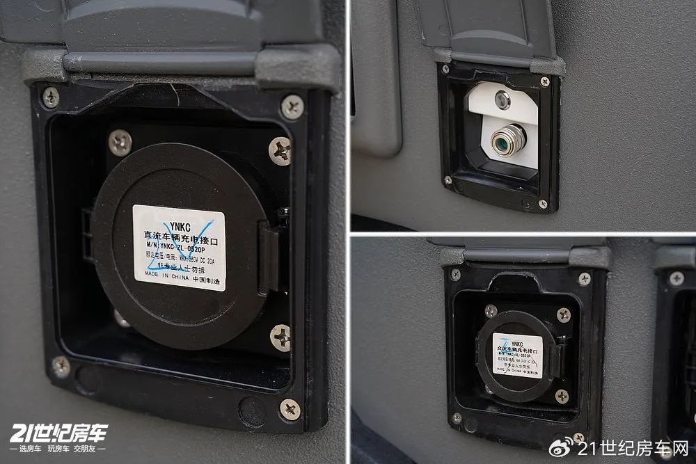 车辆外部配置丰富,安置有重力加水口、自吸加水口以及充电口等基础配置,为房车的日常补给提供了便利。