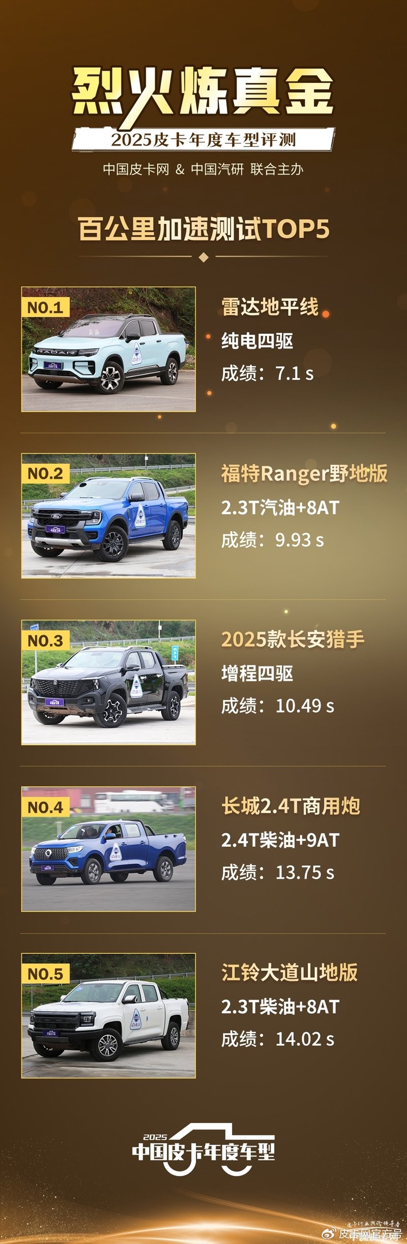 近日,2025皮卡年度车型各个奖项正式揭晓。按照往年惯例,我们会在奖项公布后陆续发布卡友最关心的客观测试数据。今天,我们将正式揭晓参评10款车型当中前5名0到100公里/小时加速成绩,该成绩是衡量一款皮卡动力性能不可或缺的参数,也是大家喜闻乐见的测试项目,今天我们就来看看到底谁在这个环节跑的最快。