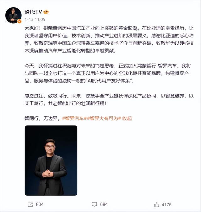 二是一位关键人物的变动。前腾势汽车的高管赵长江,不久前刚刚宣布从比亚迪离职,加入了智界汽车。他甚至在微博上转发余承东的预热内容时,写下了“行业里总需要一些产品来拔高想象力的天花板”这样的话。一位深谙高端MPV市场的前比亚迪系高管,转身加入华为系的智界,这个动作本身,就比任何广告都更能引发市场的联想和热议。他的加盟,无疑会让智界V9在打造产品体验和定义豪华标准上,更有针对性。