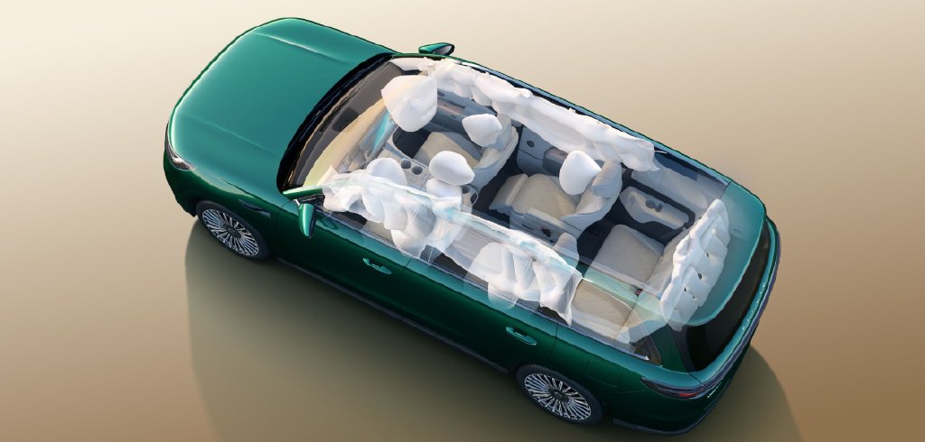 除了车身结构外,全车还配备11个安全气囊。首先,在后挡风玻璃处设有专属气囊,面积达0.64平方米,为第三排乘客提供独有的后方保护;第二排左右侧均配备长达2.2米的侧气帘,与第二排座椅两侧的腰部防护气囊共同形成保护层;第一排主副驾驶位均设有防腰部侧气囊,搭配方向盘主气囊及主驾驶膝部气囊;针对副驾前方大屏的设计,特别采用了跃屏式安全气囊,遇险时气囊能越过屏幕同时保护设备和乘员;此外,在主副驾驶之间扶手箱位置还设有双枪式远端安全气囊,能在侧碰时有效避免前排两人头部相互碰撞。