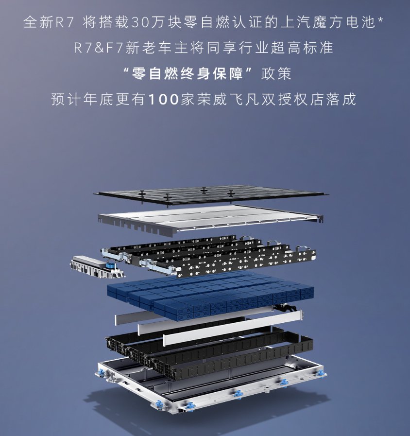 值得一提的是,全新飞凡R7将搭载30万块零自燃认证的上汽魔方电池。并且,R7和F7(配置|询价)新老车主将同享行业超高标准“零自燃终身保障”政策预计年底更有100家荣威飞凡双授权店落成。