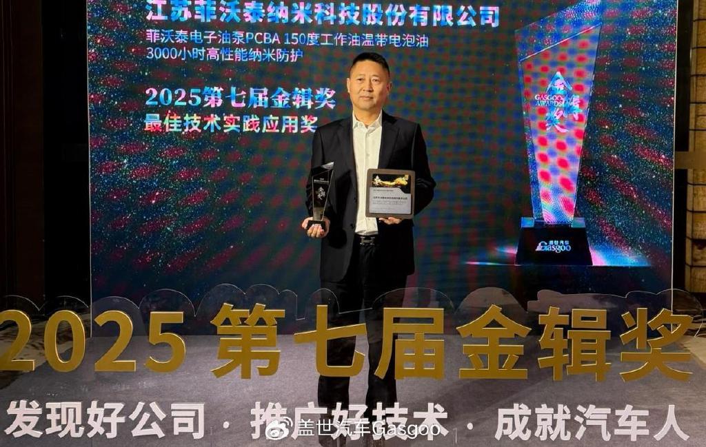 2025年10月30日,第七届金辑奖颁奖典礼在上海隆重举行。菲沃泰“电子油泵PCBA 150度工作油温带电泡油3000小时高性能纳米防护”荣膺“最佳技术实践应用奖”。董事长宗坚先生出席典礼并领奖,标志着菲沃泰在汽车电子防护领域的技术突破获得行业权威认可。