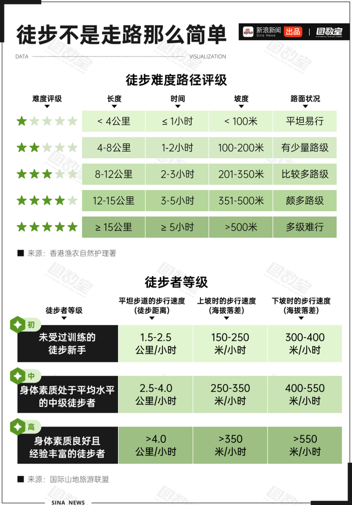 对于一条徒步路线的探险难度,不同协会、组织都有自己的评级标准,如香港渔农自然护理署将徒步路径分为从易到难5个等级,通过长度、时间、坡度、路面状况四个维度来综合判断。