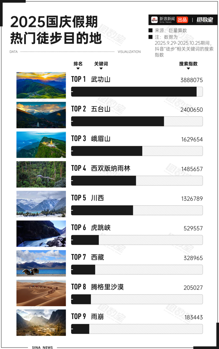 2025年中秋国庆假期,“徒步”的相关搜索指数显示,江西武功山成为最热徒步目的地,山西五台山、四川峨眉山等传统名山热度不减。