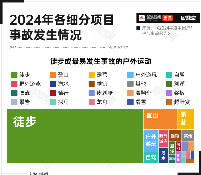 中国探险协会探险研究专业委员会发布的《2024年度中国户外探险事故报告》显示,2024年共发生户外探险事故335起,涉及人员1126人,受伤92人,死亡84人,失踪11人。其中徒步项目涉及人员高达822人,占总事故涉及人数的73%。而徒步事故中最大比例的原因是,迷路。