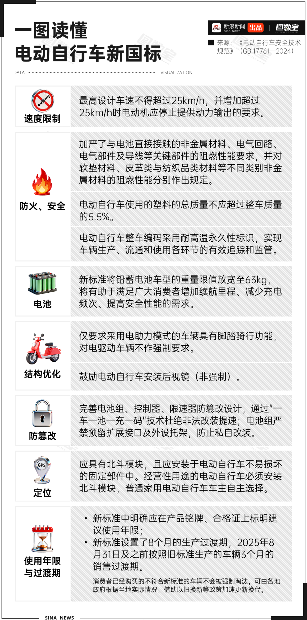 2025年12月1日起,新国标《电动自行车安全技术规范》全面落地实施,不符合新规的“旧国标”车将全面停售。新国标在电动自行车速度、车辆防火阻燃、塑料占比等方面都做出了更严格的规定。