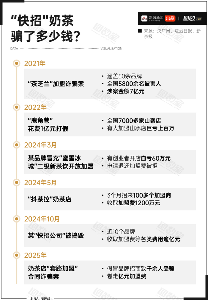 据报道,2021年,一起涉及50多个奶茶品牌的“快招”加盟诈骗案被警方侦破,全国超5800人受害,涉案金额高达7亿元。该品牌代言明星随后公开道歉并解约。