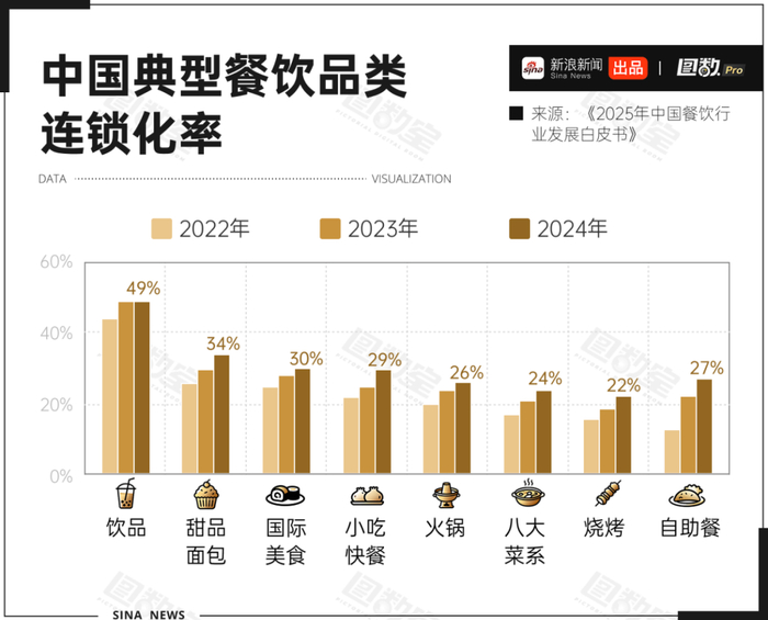 《2025年中国餐饮行业发展白皮书》显示,我国各餐饮品类的连锁化率在不断提高,2024年饮品连锁化率近50%。除了前文提到的奶茶咖啡,甜点面包、国际化美食、火锅等大型连锁品牌都大刀阔斧向县城布局,这些品牌自带知名度、成熟体系和供应链优势,疯狂挤压个人小店的生存和成长空间。