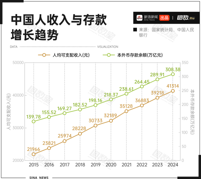 因为他们可能是当下最有钱有闲还有焦虑的一群人。从2015年到2024年,全国人均可支配收入从近2.2万元涨到了4.1万元,几乎翻倍。而全中国人的存款更是惊人,从不到140万亿元飙升到308万亿元。