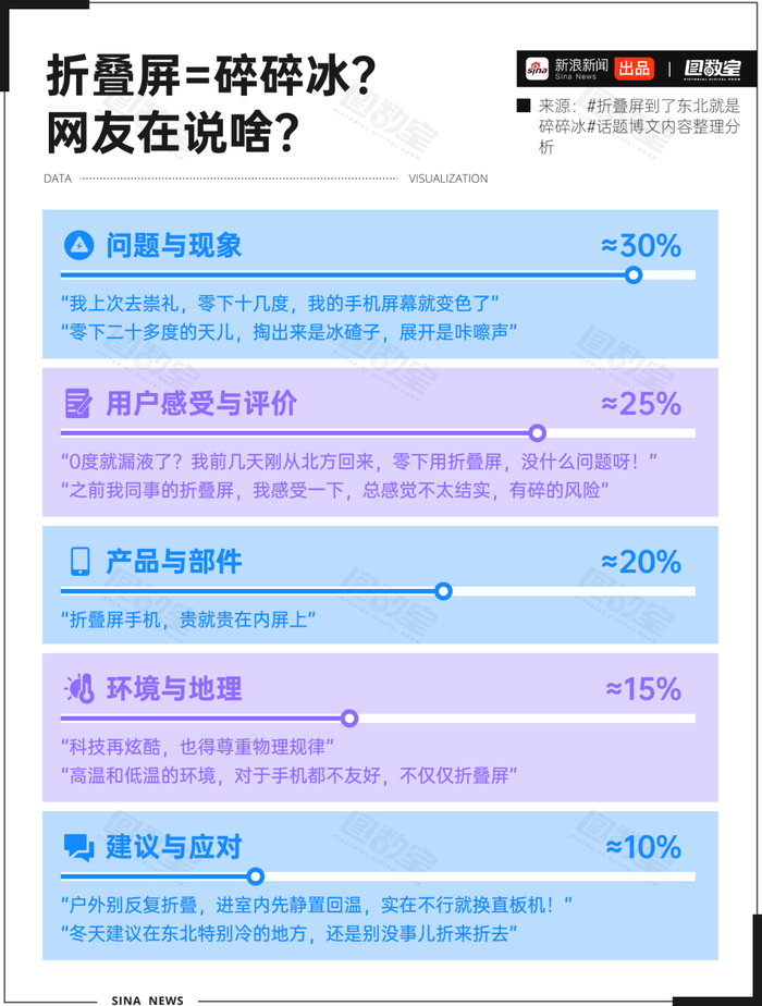 话题词下,网友们众说纷纭。有三分之一是现身说法的“经历派”,“零下二十多度的天儿,掏出来是冰碴子,展开是咔嚓声”;有25%的网友聚焦“感受与评价”,有人质疑“0度就漏液?”,也有人坦言“总觉得不太结实”;约20%的讨论指向“产品与部件”,强调“折叠屏手机,贵就贵在内屏上”。此外,还有理性科普的、出谋划策的。