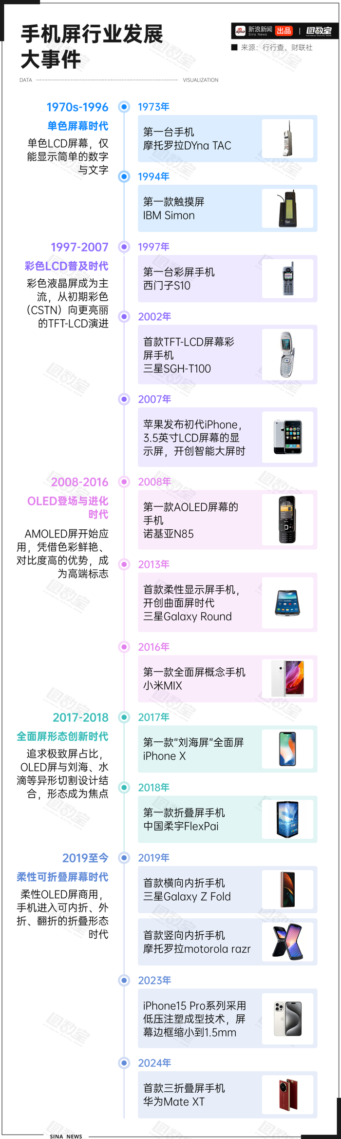 1973年,手机诞生,当时的手机屏幕仅能显示单调的文字与数字。2007年,iPhone以电容式多点触控屏掀起交互革命,开启了智能手机时代。在此之后,显示技术方面出现了巨大的进步,屏幕像素和屏幕亮度得到了明显提高。