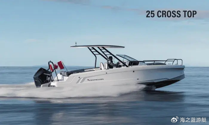 Axopar 25 Cross Top:运动型巡航艇,配备高架船舱,适合过夜航行,最高航速40节,设有全宽日光浴平台。