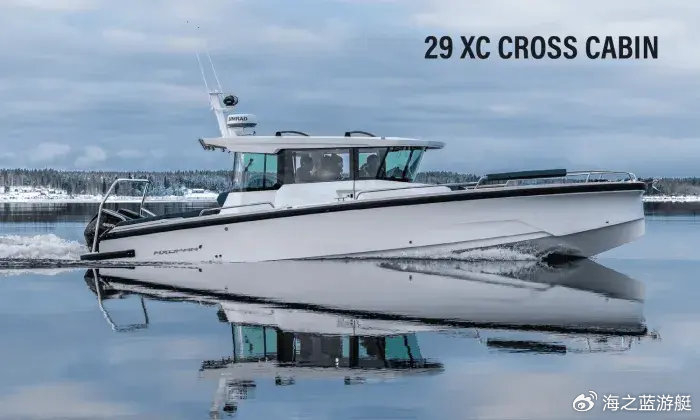 Axopar 29 XC Cross Cabin:跨界多功能游艇,配备全封闭式船舱与全景窗户,实现室内外空间无缝衔接,优化船体设计提升续航能力,可容纳9人。