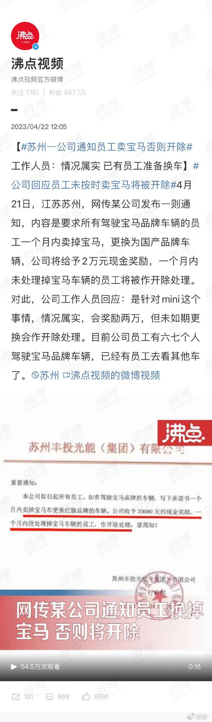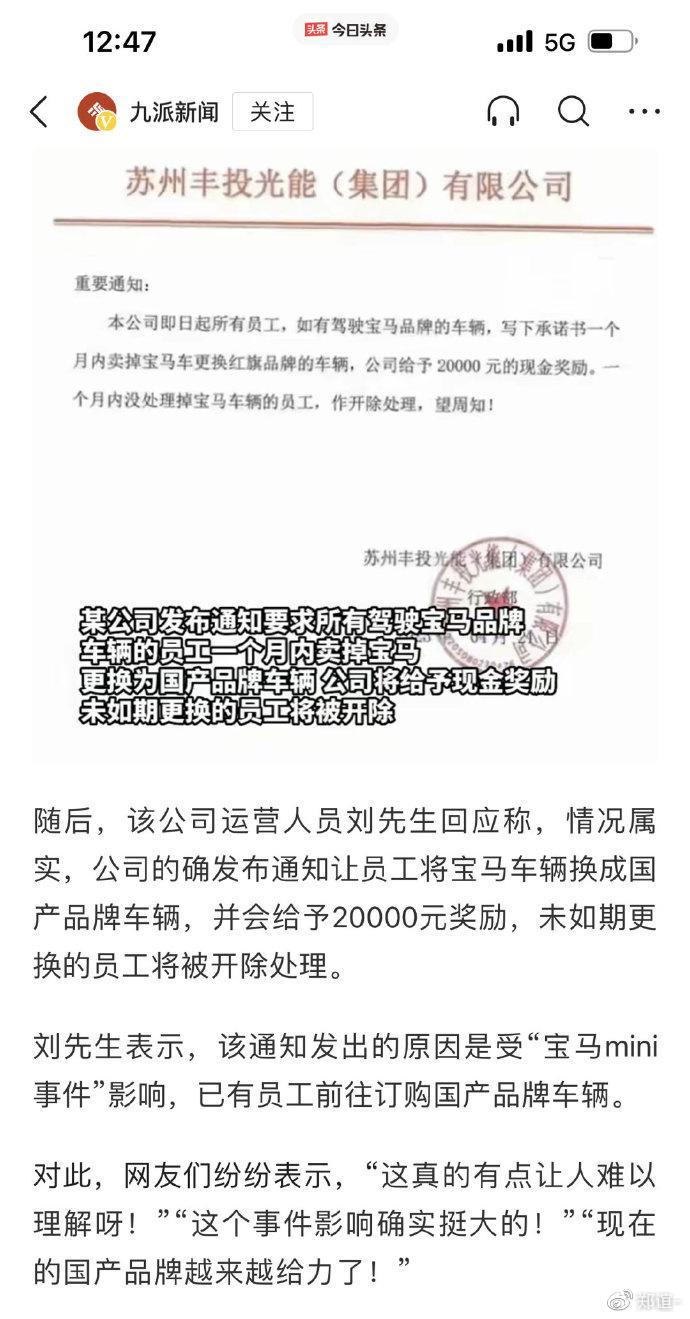 近日,网上曝出了一家公司,已经开始要求员工在1个月内换掉宝马,并且提供20000元的奖励,如果到期不换,那么将被开除。