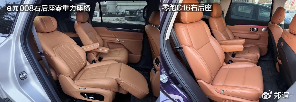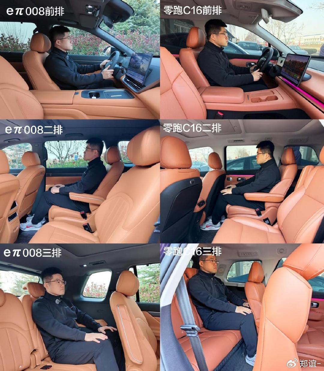 以身高175cm,体重160斤的体验者为例,乘坐eπ008的车内,前中后三排均能保留充足余量,头部与腿部不会感到局促,而零跑 C16 若前两排按舒适姿势调整后,第三排腿部空间会明显受限,长时间乘坐易产生疲劳感。所以C16的第三排更适合小朋友乘坐。