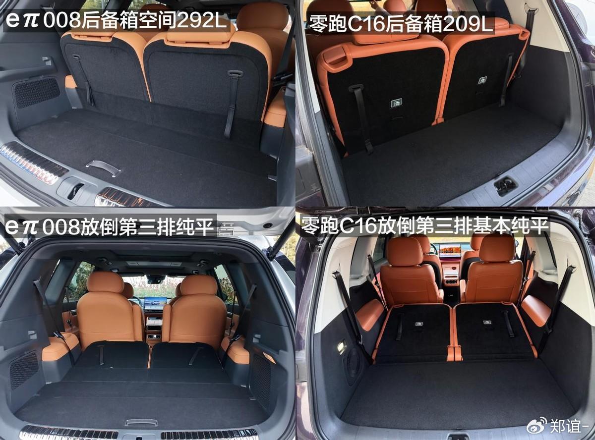 相比之下,零跑 C16 第三排座椅放倒后并非完全纯平,存在一处小台阶,这也限制了空间的场景化利用,eπ008 可借助纯平后备箱实现大床模式,长途休息或露营时能提供更灵活的使用场景,而零跑 C16 的空间灵活性则略逊一筹。