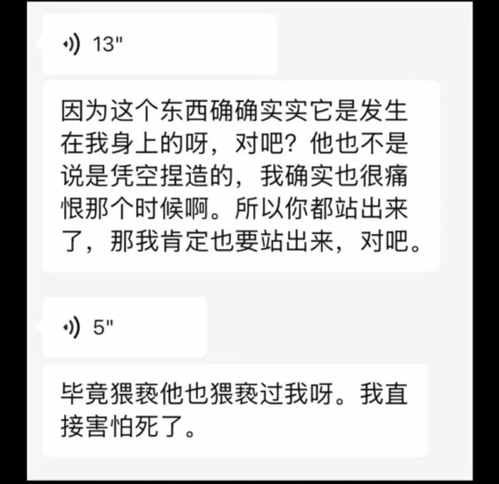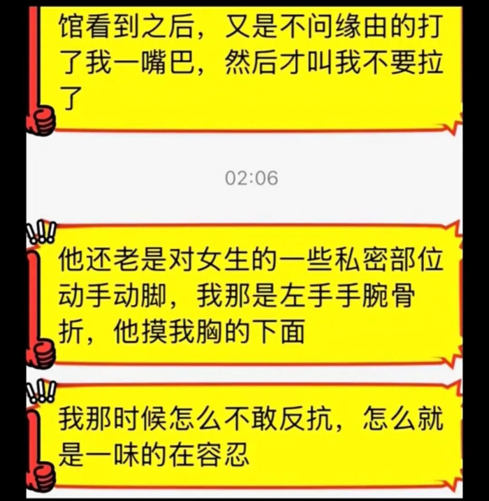 另一段聊天记录显示,有人给她说,“他还老是对女生的一些私密部位动手动脚。他摸我胸的下面,我那时候不敢反抗一味的在容忍。”