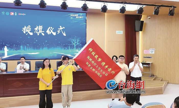 启航展开新篇,授旗仪式将现场气氛推向高潮。宁德市科学技术协会党组书记、主席王怀宇为三校学生代表授旗。当厦门大学张灿源、金门大学林哲宇和香港科技大学张镜芯三位队长接过象征责任与使命的旗帜时,全场响起热烈掌声。