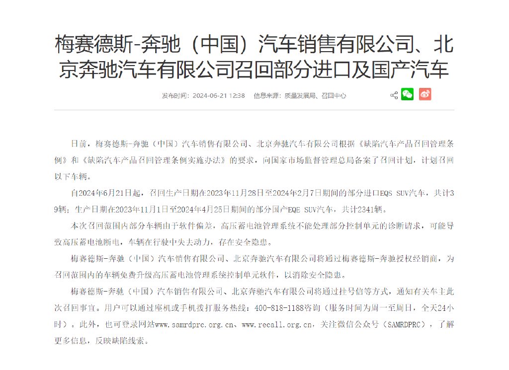 其一、从2024年6月21日起,召回生产日期在2023年11月28日至2024年2月7日期间的部分进口EQS SUV(配置|询价)汽车,共计39台。