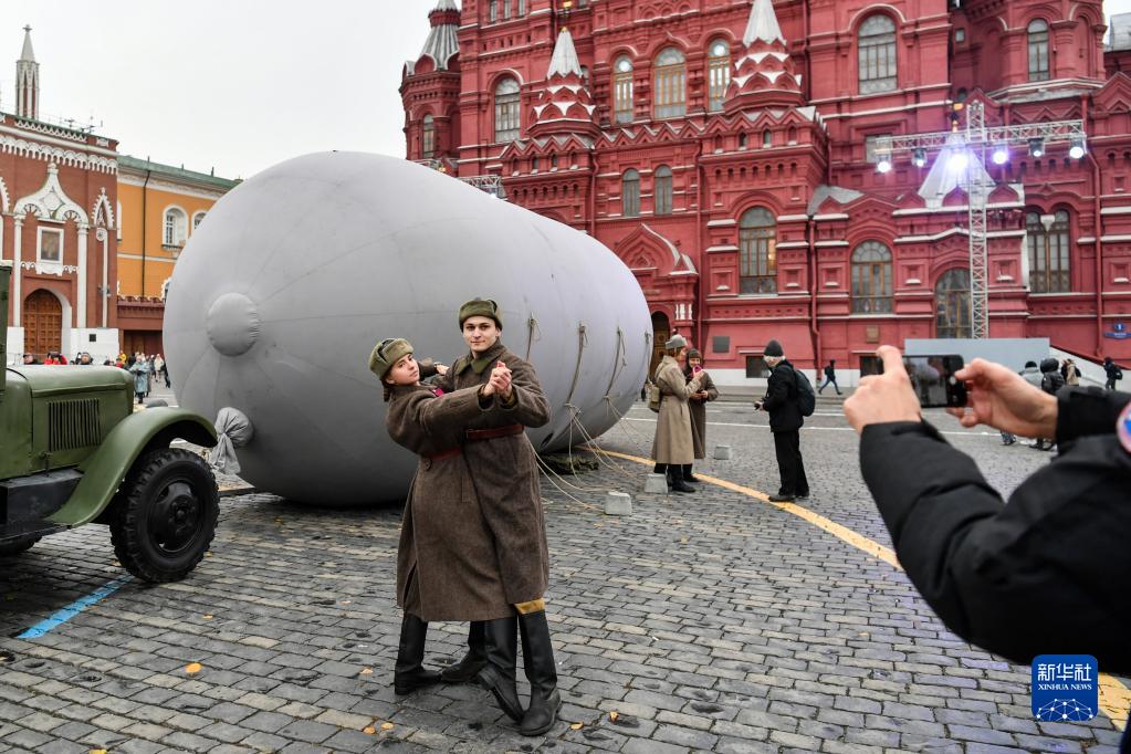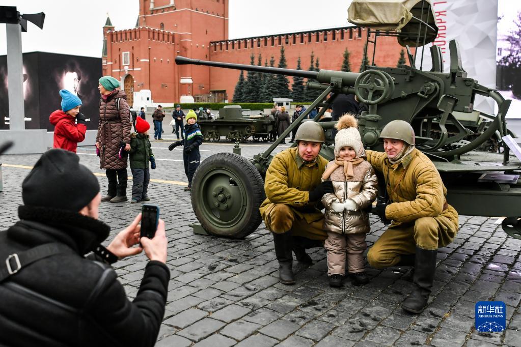 11月7日,在俄罗斯首都莫斯科,人们在以纪念1941年苏联红场阅兵式为主题的露天展览上拍照。当日,俄罗斯在红场举行露天展览,纪念1941年苏联红场阅兵式。新华社记者 曹阳 摄
