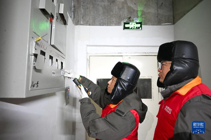12月16日,国网内蒙古东部电力有限公司呼伦贝尔供电公司工作人员在内蒙古呼伦贝尔市海拉尔区苹果花园小区查看用户电能表参数,确认电压电流是否正常。为应对近期大范围寒潮和低温雨雪冰冻天气,各地、各部门采取多种措施,全力保障人民群众安全温暖过冬。新华社记者 贝赫 摄