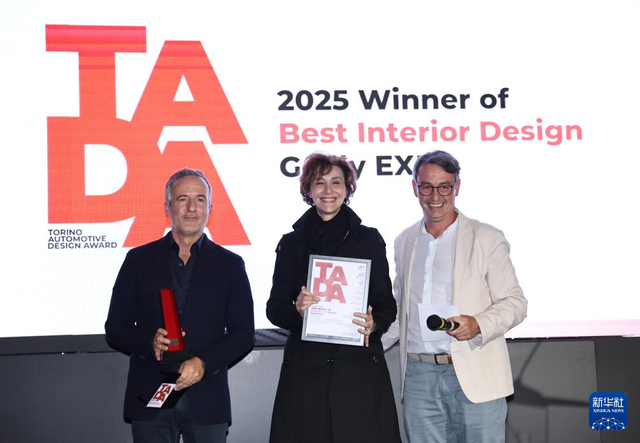 9月26日,在意大利都灵,荣获“都灵汽车设计奖”最佳内饰设计奖的吉利“银河E5”代表领奖。新华社记者 李京 摄