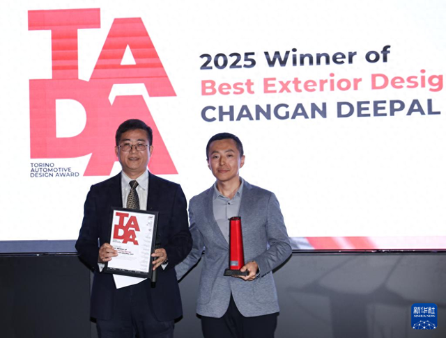 9月26日,在意大利都灵,荣获“都灵汽车设计奖”最佳外观设计奖的长安“深蓝S07”代表领奖。新华社记者 李京 摄在都灵皇宫举行的颁奖典礼上,五款中国车型获奖。评审团认为,这些车型在材料运用、智能交互、空间体验、设计创新和外观美学等方面展现了中国汽车的竞争力。