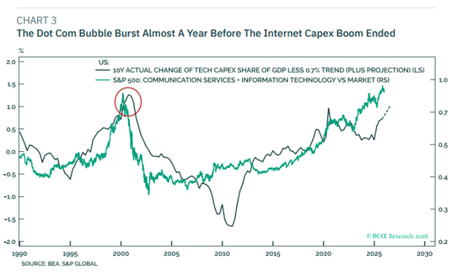“因此,为了评估当前人工智能资本支出热潮的局限性,我们必须从相对角度而非绝对值来看待科技资本支出,即相对于其结构性增长而言。一个好方法是,考察科技资本支出占GDP的十年变化,减去每十年0.7%的结构性增长趋势,”他写道。